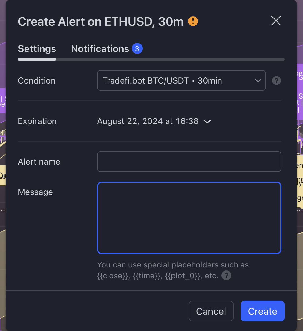 With Tradefi.bot's TradingView integration, you can easily create alerts directly from the TradingView app. This feature allows you to stay informed about market movements and trading signals without constantly monitoring the charts.