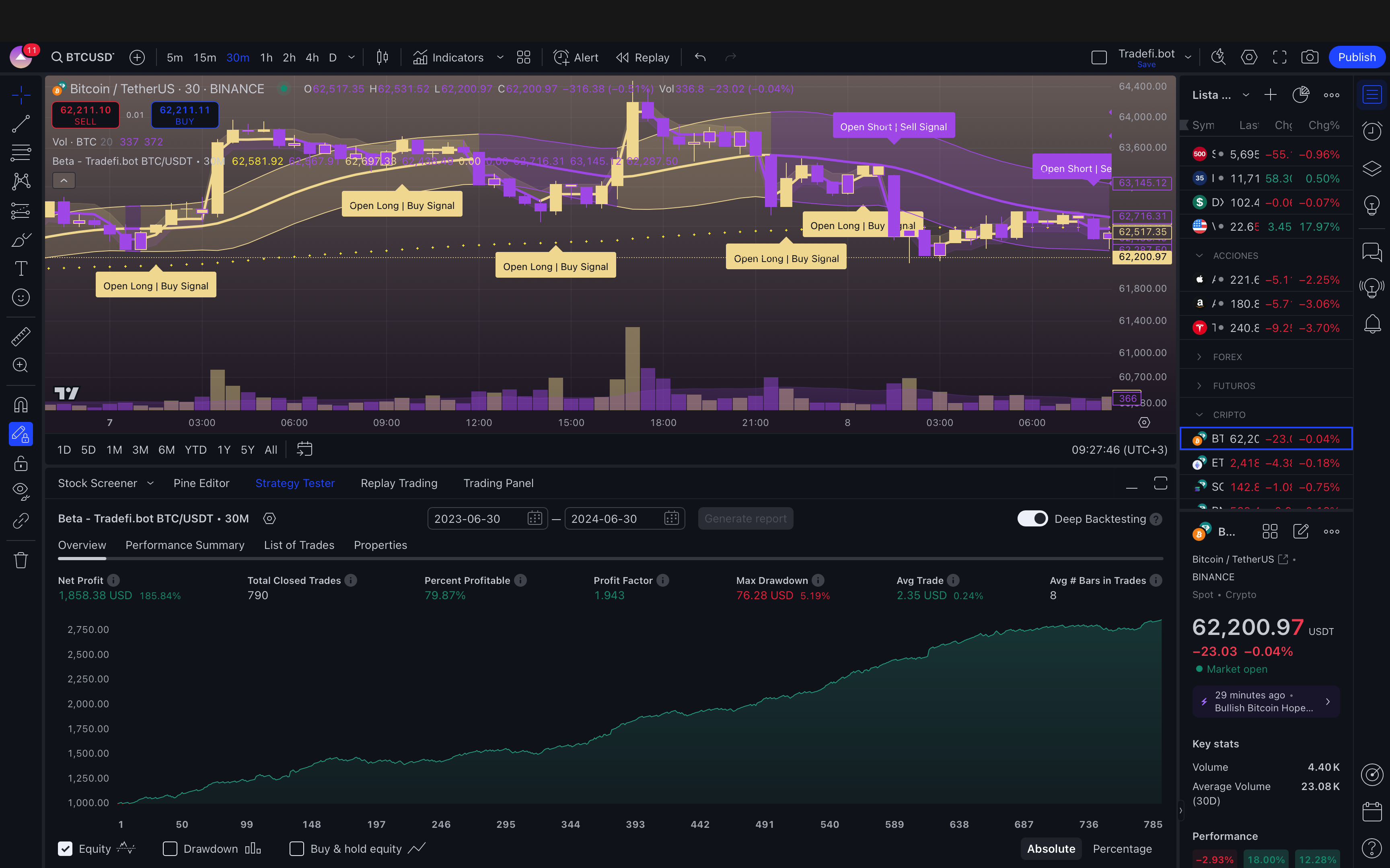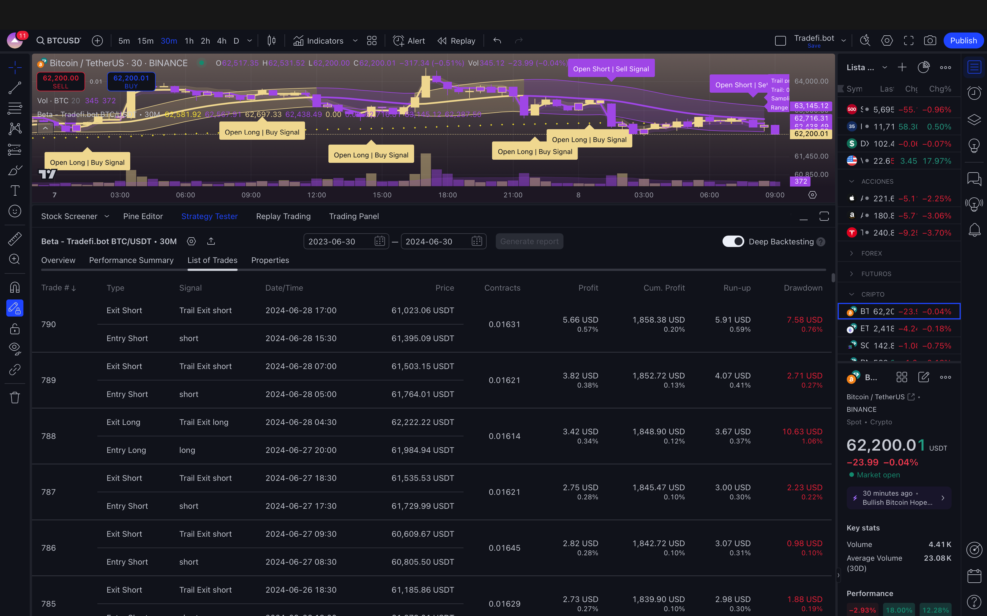 This section provides an in-depth analysis of the performance of the BTC/USDT Decentralized AI Trading Bot on the 30m timeframe. Using historical data and advanced algorithms, this backtest demonstrates how the bot navigates market conditions, identifying optimal buy and sell signals. The results offer valuable insights into the botβs ability to capture trends and manage risk over longer timeframes.