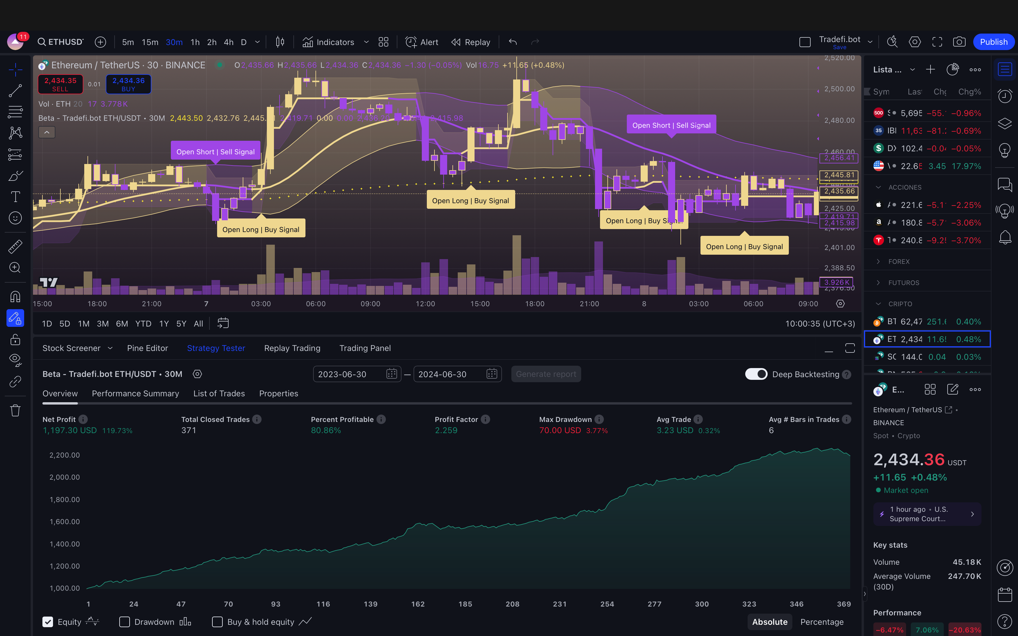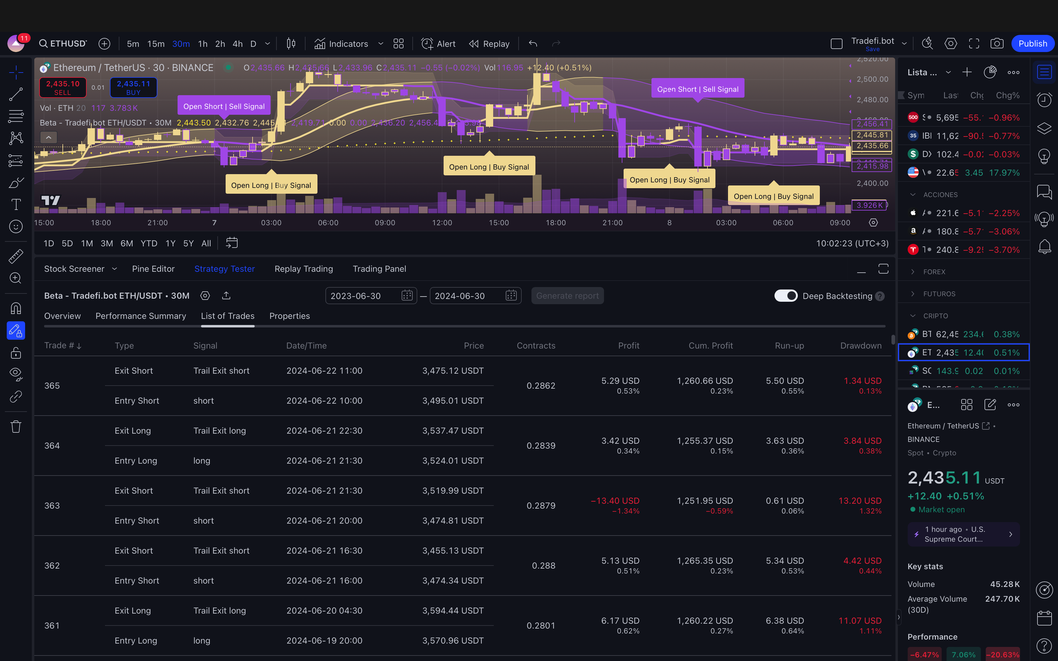 This section provides a comprehensive analysis of the performance of the **ETH/USDT Decentralized AI Trading Bot**on the **30m timeframe**. Utilizing historical data and AI-driven strategies, this backtest showcases how the bot captures market movements, executing precise buy and sell signals. The results highlight the bot's ability to adapt to market trends and effectively manage risk in longer timeframes.