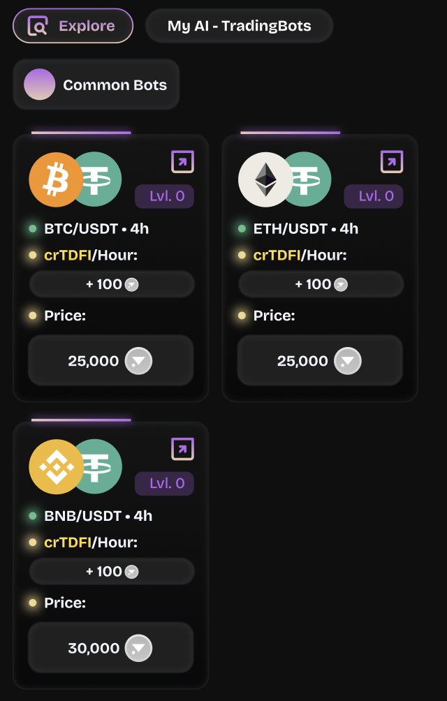 3\. Upgrade your bots to increase their crTDFI generation capacity and optimize your passive income.